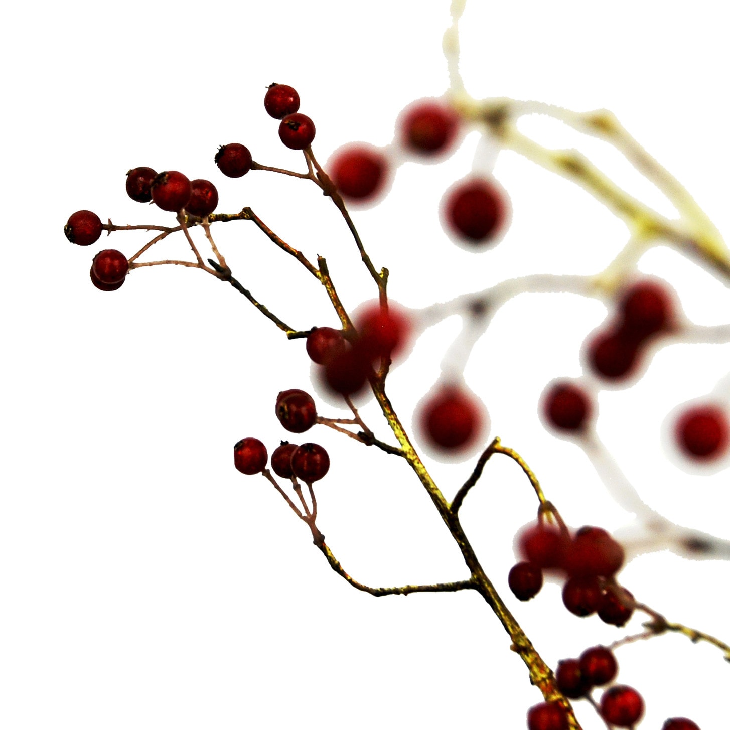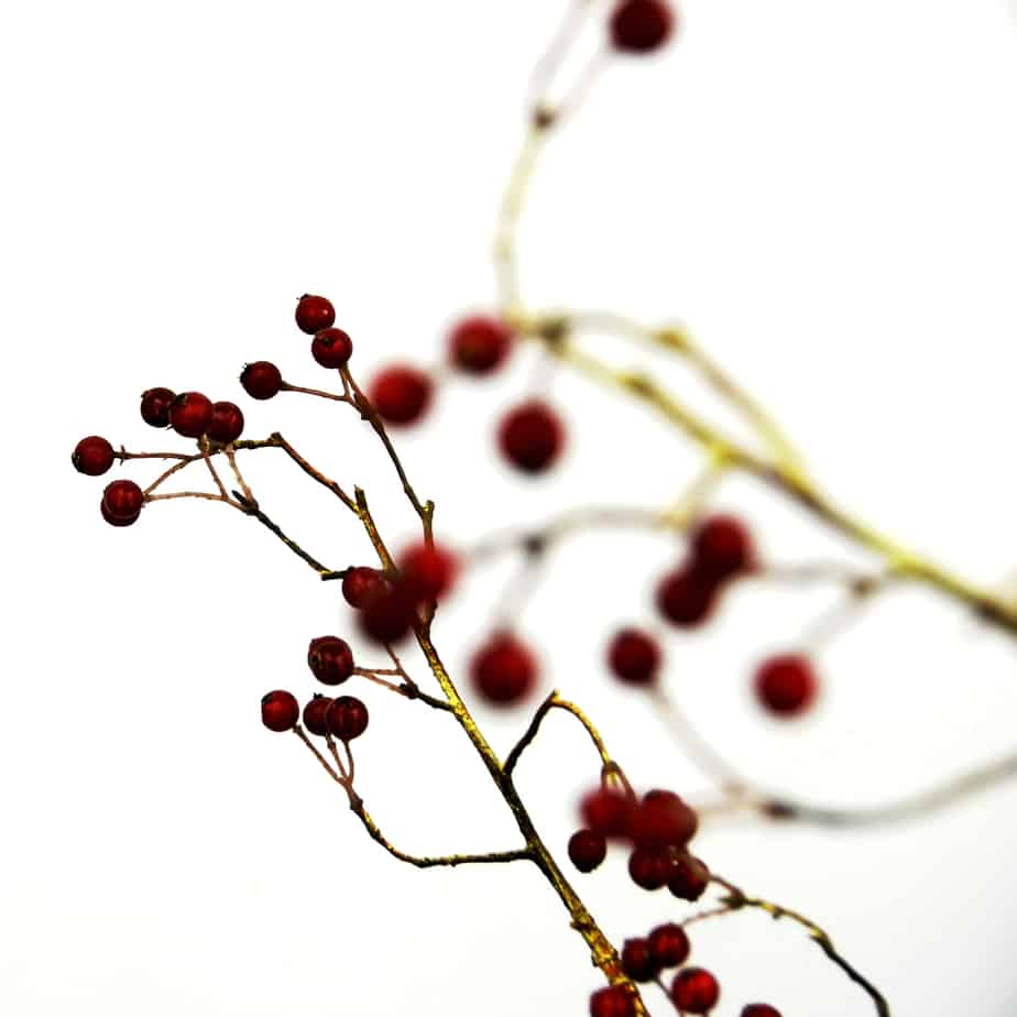 Dit is een 133 cm hoge, schitterende kunstversie van een bessentak met rode bessen. De steel heeft een goudkleurig gloed. De takjes zijn tot vrijwel aan de bessen, gevuld met ijzerdraad zodat je de tak prachtig kunt schikken.