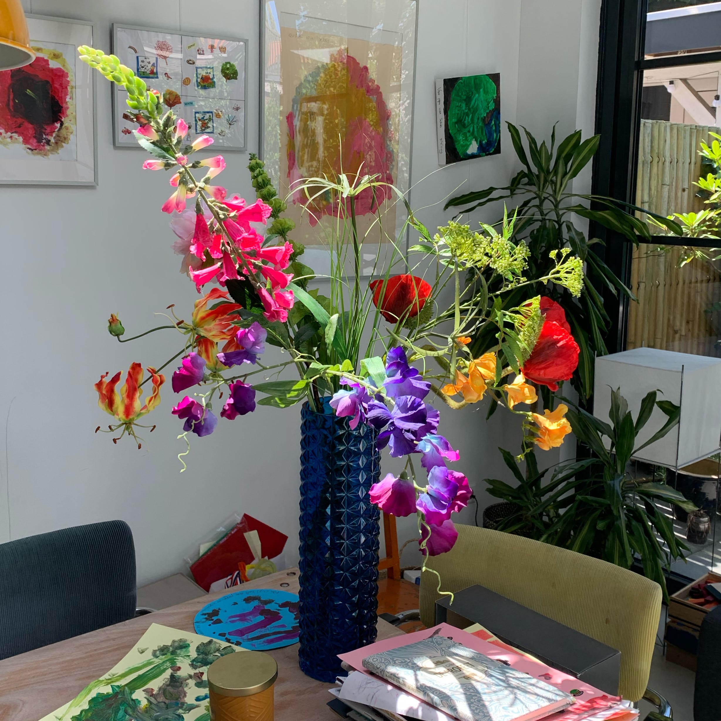 De bloemen zijn van zijdemix of real-touch kunststof en vrijwel niet van echt te onderscheiden. ‘Omdat de bloemen niet verwelken, kunnen we abonnementen aanbieden waarbij we eens per maand of eens per seizoen, nieuwe bloemen brengen en de oude weer ophalen. We passen de bossen aan bij het seizoen en wat er op dat moment in de bloemenwinkels staat. Zo is het net alsof je verse bloemen hebt en dat voor ongeveer de helft van de prijs.