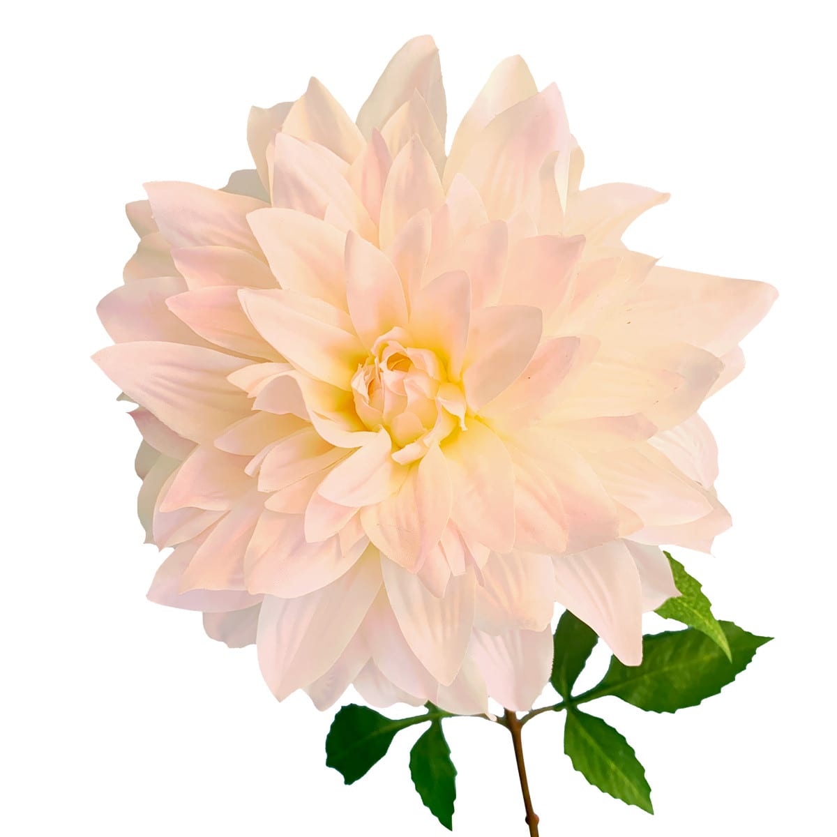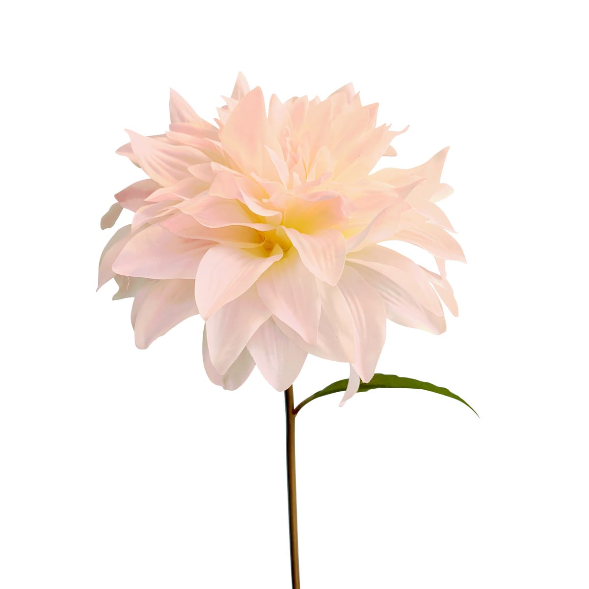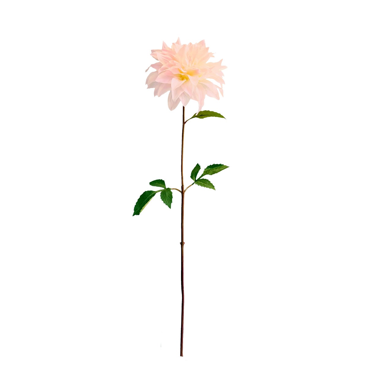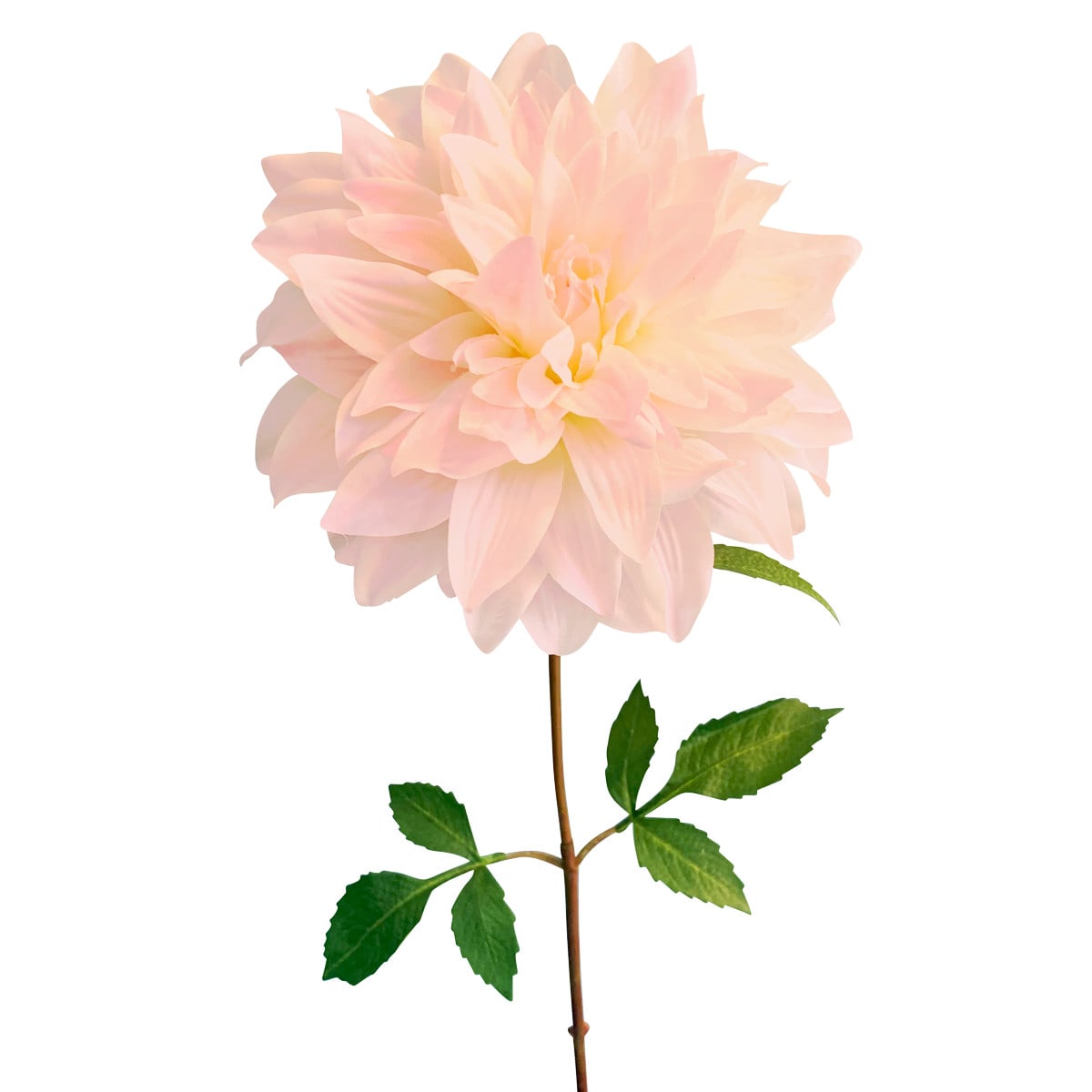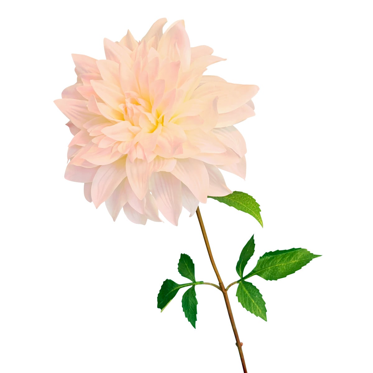 Een prachtige dahlia met een bloem en 3 bladtakken. De meerlagige bloem maakt een schitterende indruk met zijn subtiel gekleure bloembladeren in de kleuren wit-roze – afmeting: 73 cm