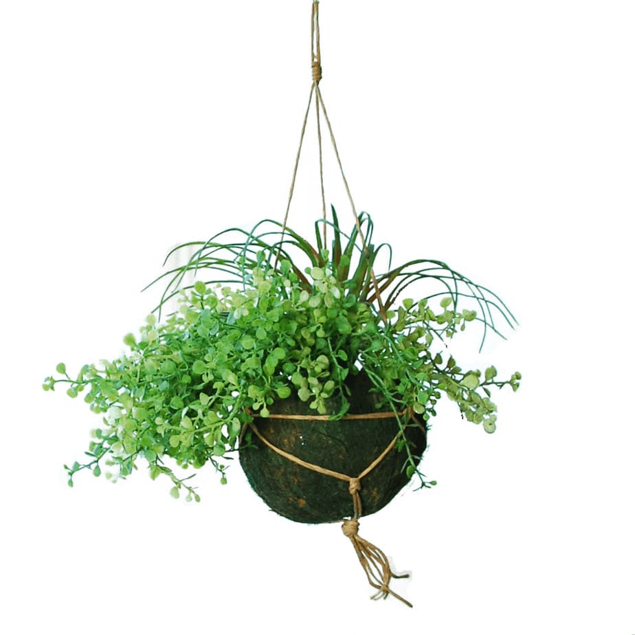 A hanging basket made of a coconut with artificial Myosotis and Tillandsia. The coconut is only about 7 cm deep. The hanging basket is 40 cm from top to bottom. That is including the little fringe at the bottom.