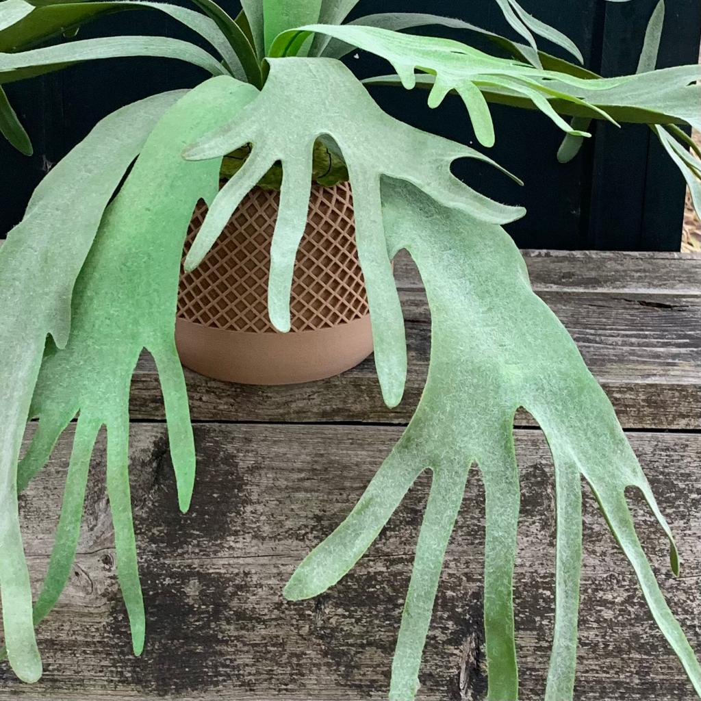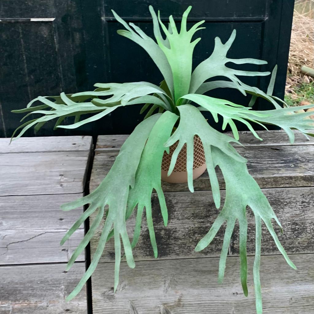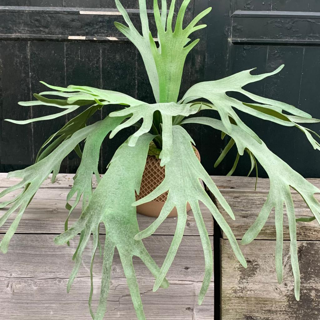 Een schitterende Hersthoorn varen, ook wel Kokodama Platycerium genoemd. Niet van echt te onderscheiden, 79 cm hoog en bladeren met – de voor de hersthoorn kenmerkende – waas van grijs groen.