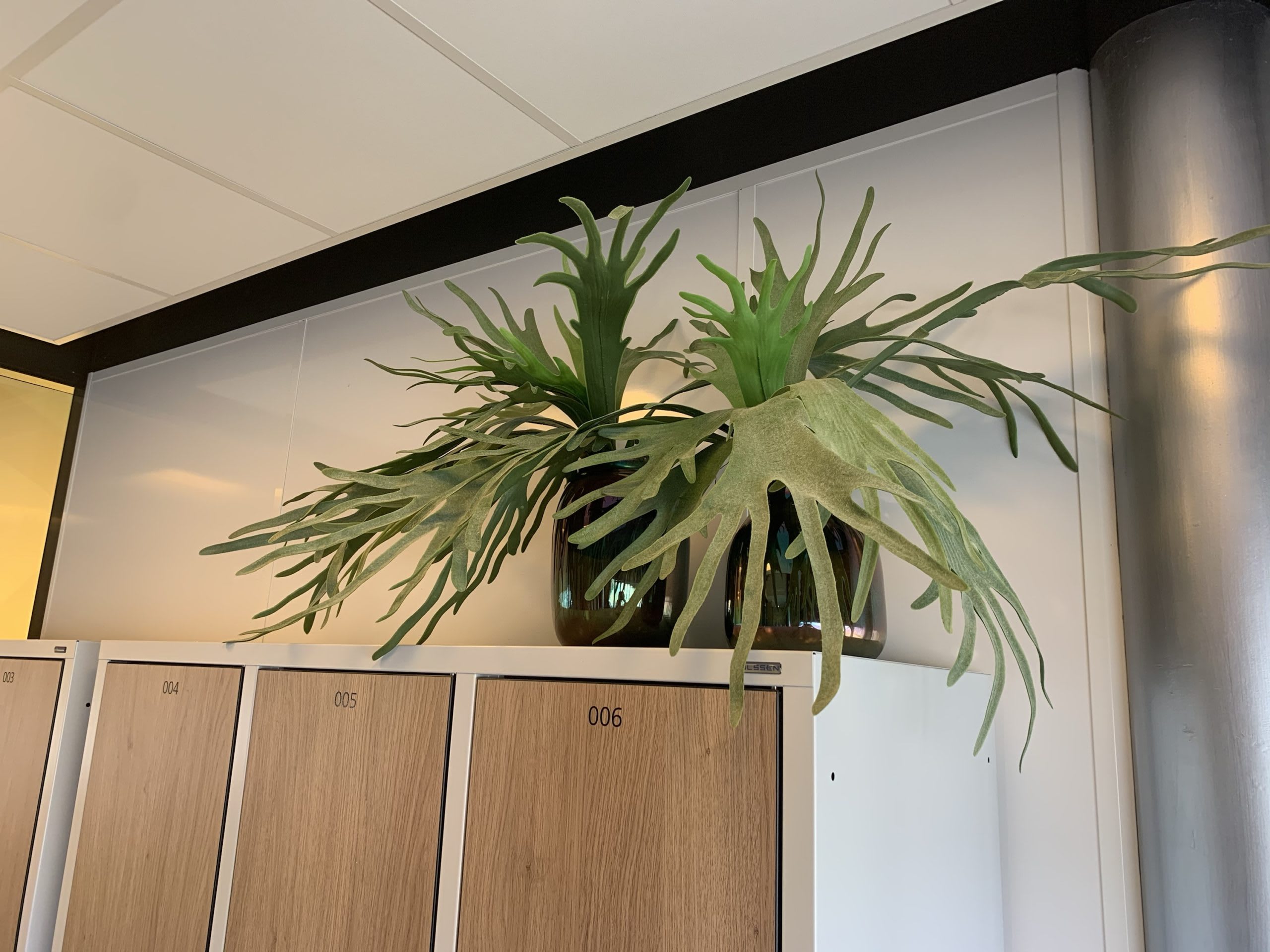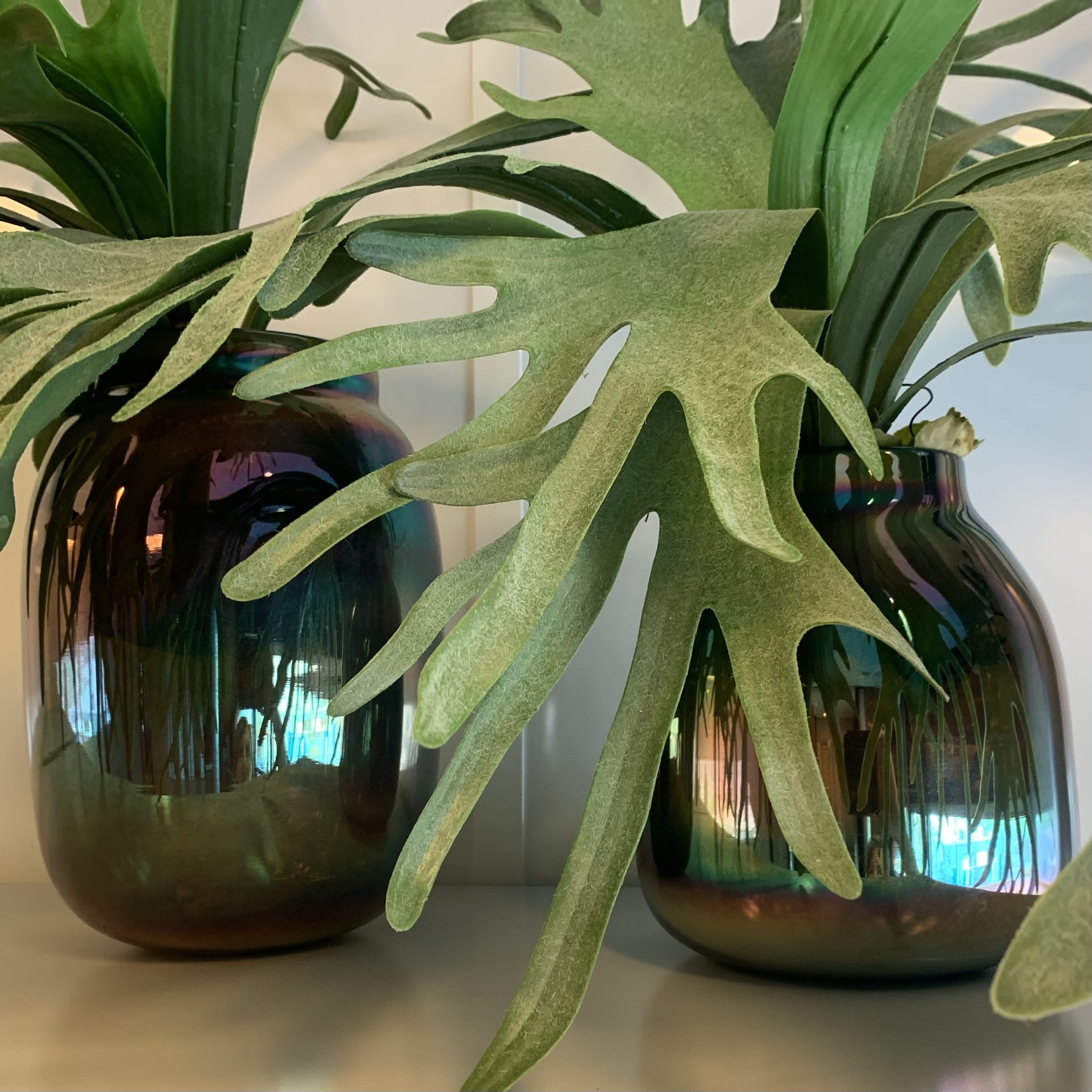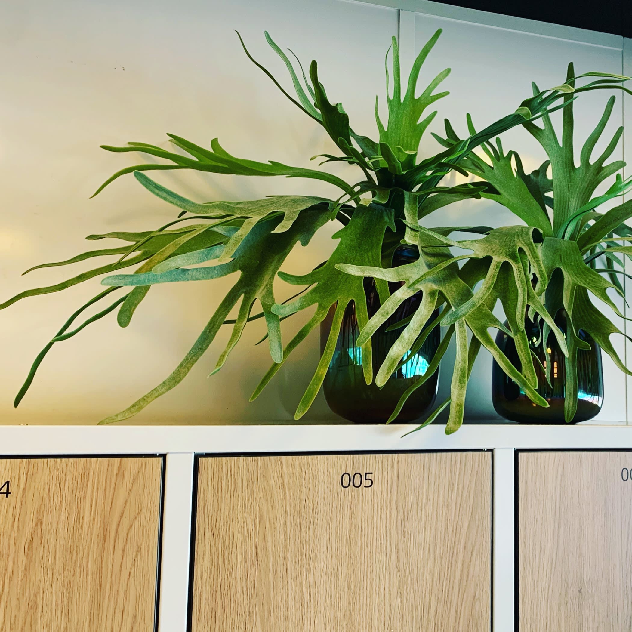 Een schitterende Hersthoorn varen, ook wel Kokodama Platycerium genoemd. Niet van echt te onderscheiden, 79 cm hoog en bladeren met – de voor de hersthoorn kenmerkende – waas van grijs groen.