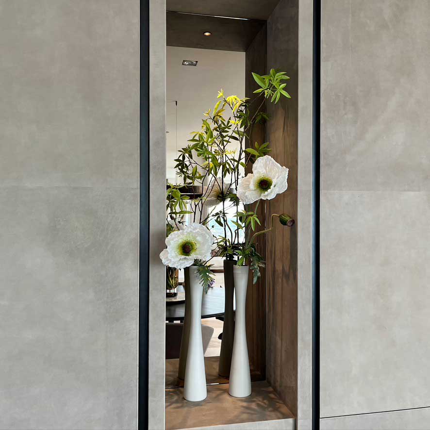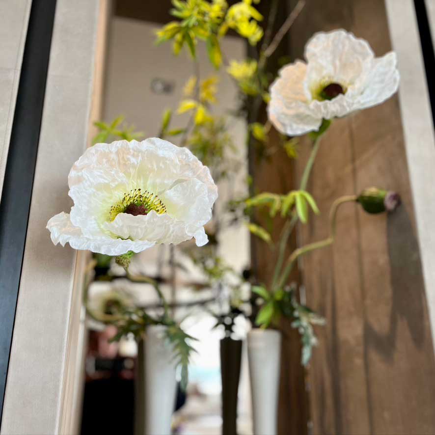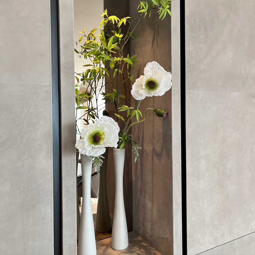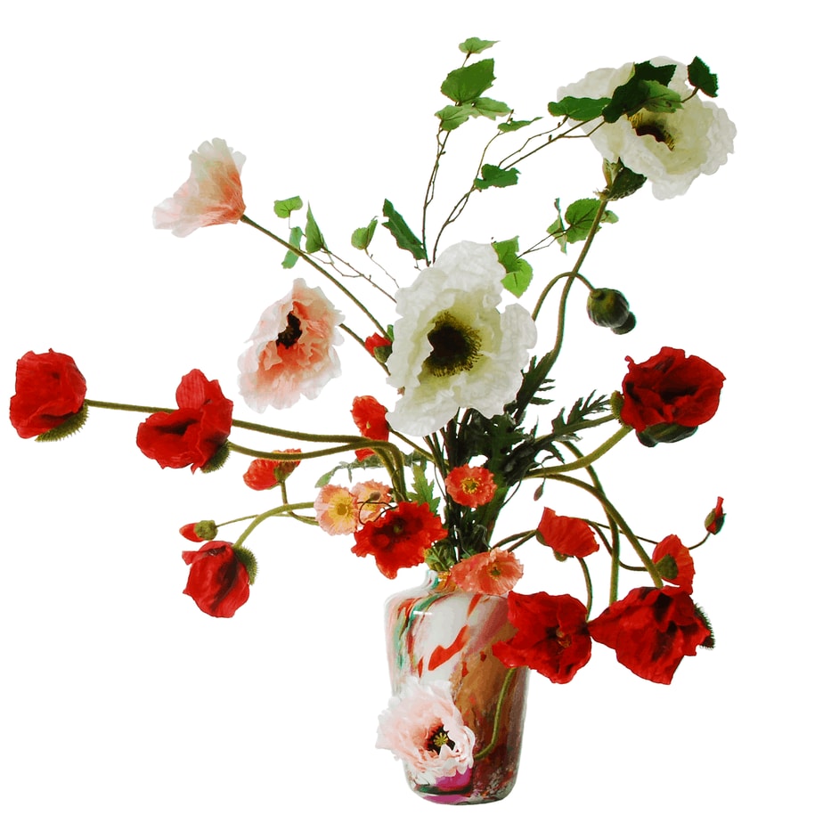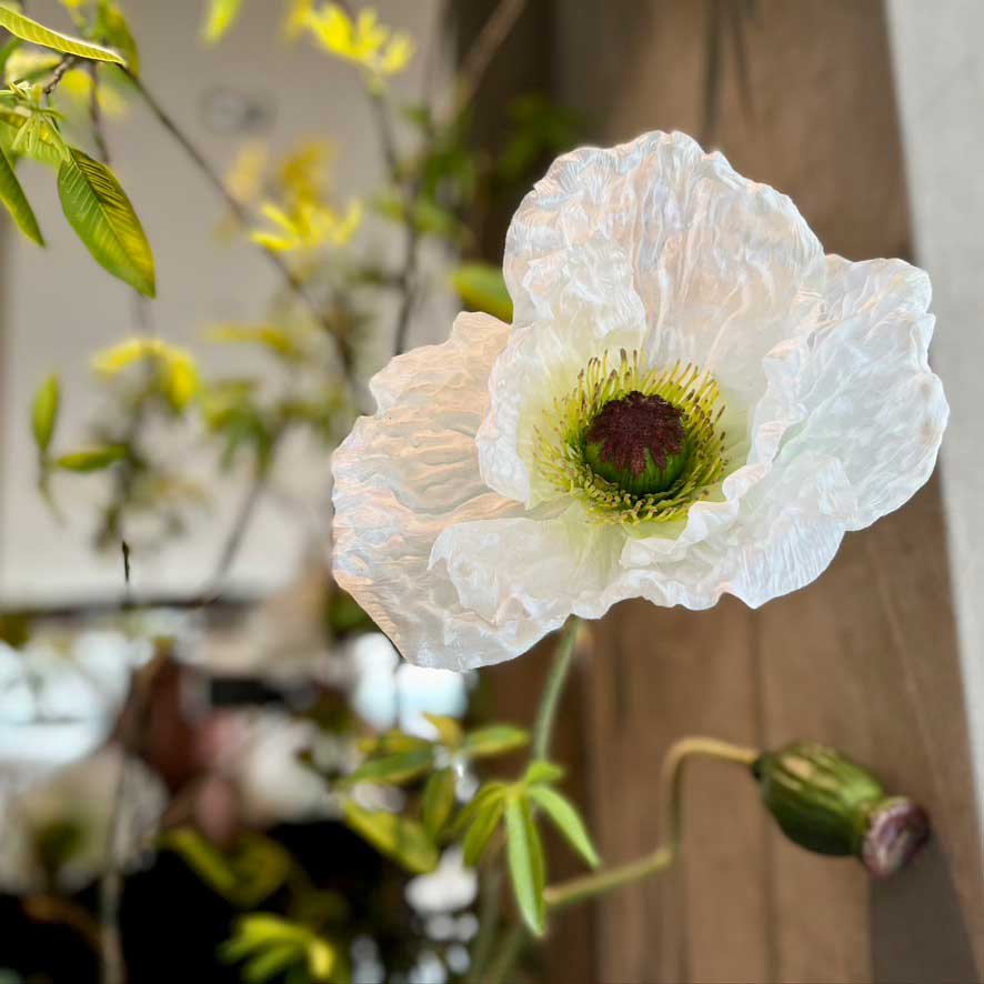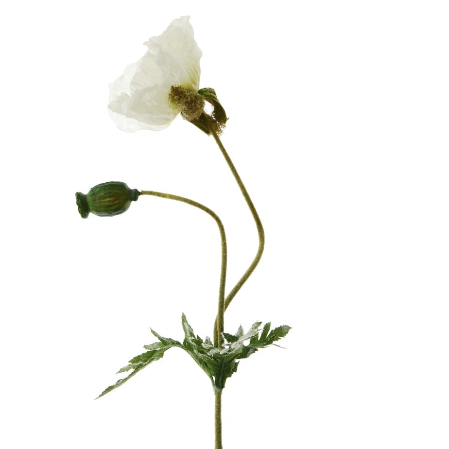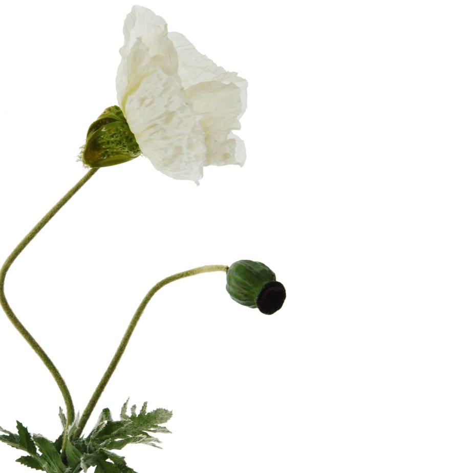 Je kunt de bloemen en takken uit onze bloemenwinkel ook allemaal goed combineren met verse bloemen, zolang je de steel van deze papaver niet afknipt. Als je dat namelijk doet, is de steel niet meer afgesloten en komt het ijzer in de steel in aanraking met het water in de vaas. Het ijzer zal dan gaan roesten. ‘Met vies water en mogelijk een roestplek in jouw vaas als gevolg. Sonde!