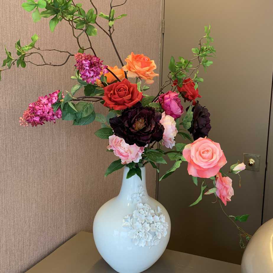 In dit boeket zitten real touch rozen in de kleuren oranje, rood en roze. En daar zijn licht roze, fuchsia roze en donkere, bijna pars-rode pioenrozen aan toegevoegd. Allemaal schitterende exemplaren van hele mooie kwaliteit. Om het af te maken zijn er takken met fuchsia roze seringen aan toegevoegd en een tak met groen. In alle stelen zit ijzerdraad. Ideaal om de bos goed te schikken.