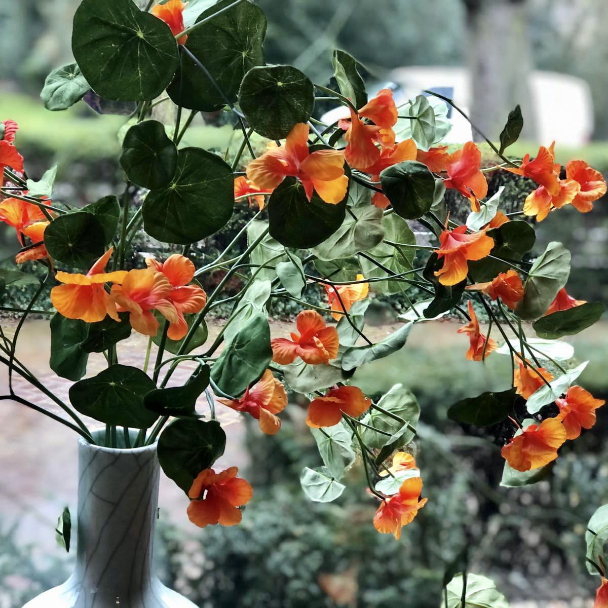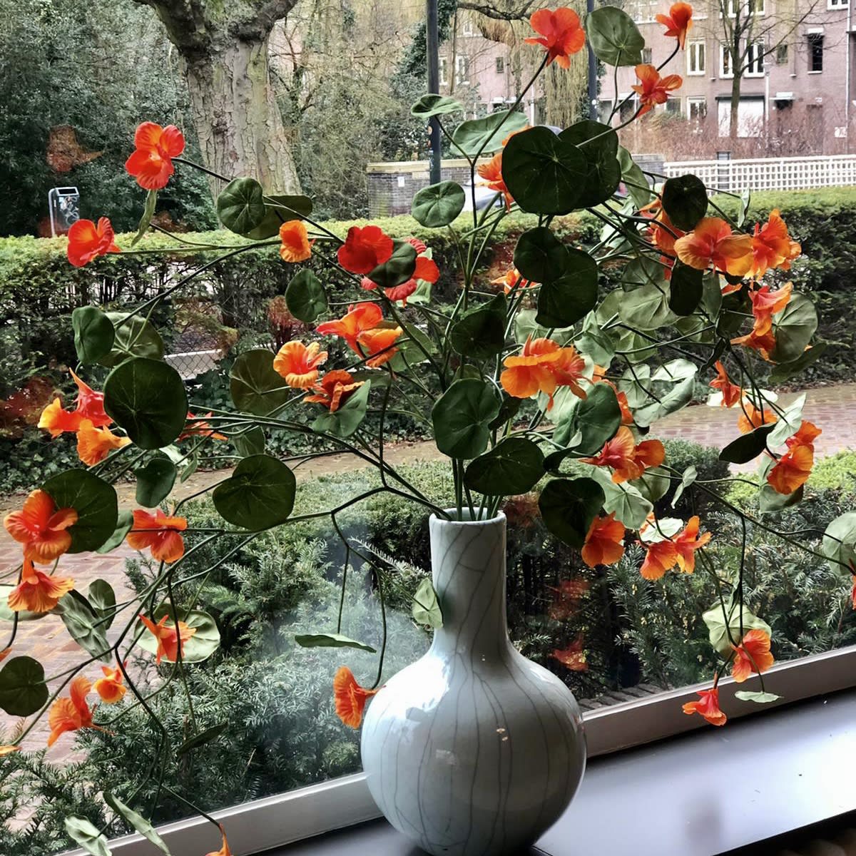 Dit is een 103 cm hoge, schitterende imitatie van lange tak met donker oranje Oost-Indische Kers