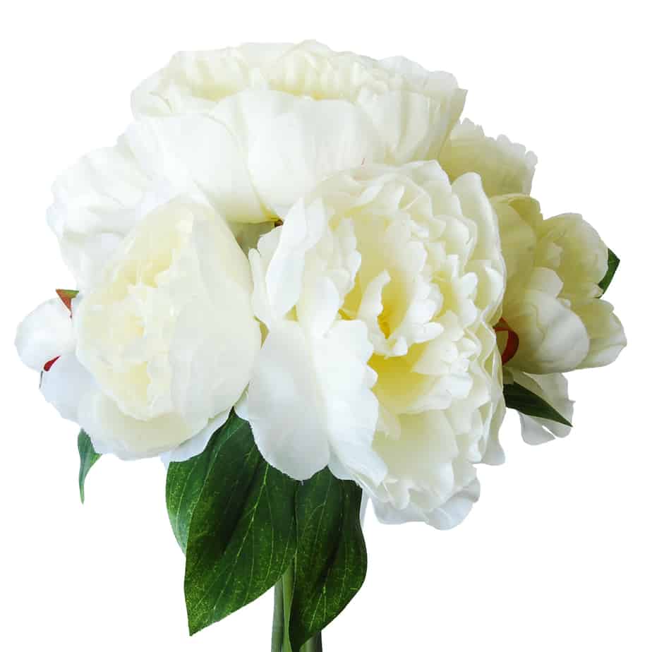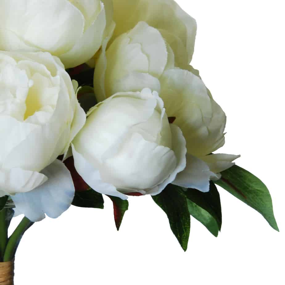 Deze Pioen boeket bloeit met – wat je noemt – ‘grootbloemige’ bloemen met een 6 bloemen en 2 knoppen die wit van kleur zijn en drie takken met blad.