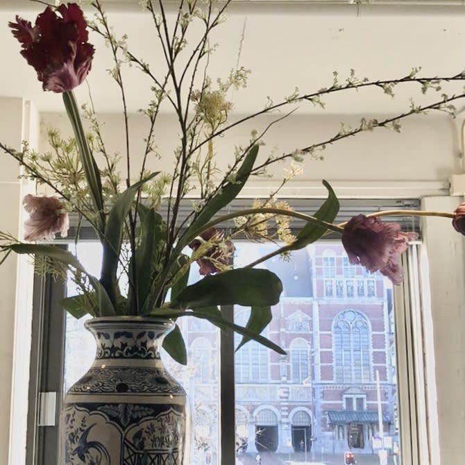 Een prachtig tulpen boeket in verschillende tinten paars. Een combinatie van parkiettulpen, ook wel Rembrandt tulpen genoemd, dille in 2 kleuren en bloesem in verschillende lengtes.