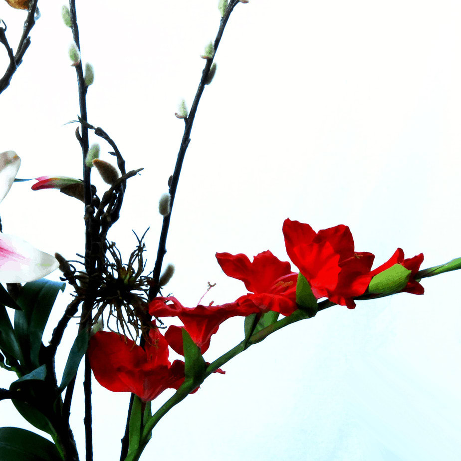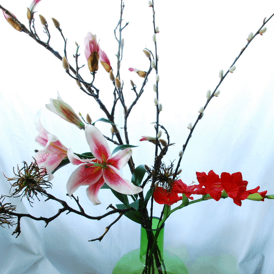 In dit boeket op het plaatje zitten perfecte imitaties van lelies, katjes, een gladiool en de toverhazelaar. Simpel en prachtig!