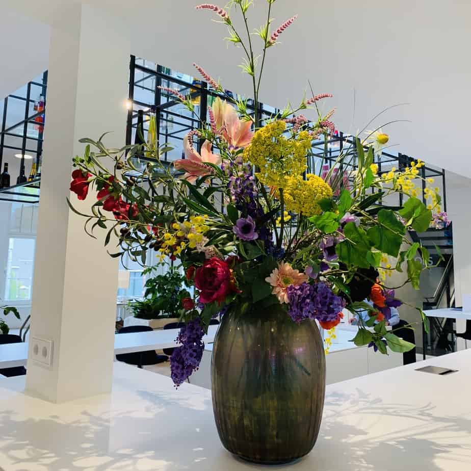 In dit boeket zitten zijden bloemen en kunstbloemen in de kleuren geel, paars, wit, oranje, rood, fuchsia, blauw en roze. Het kunst bloemen boeket is opgemaakt uit echinacea, lavendel, pioenrozen, lelies, een stokroos, ranonkels, mimosa, een gerbera, clematis, seringen, digitalis, klaprozen, een olijven tak, gipskruid en zelfs een vuurpijl. Allemaal schitterende kunstbloemen en vrijwel exacte replica van de echte versies. De kunstbloemen zijn van hele mooie kwaliteit. Om het af te maken is er een tak van berken blad aan toegevoegd. Ook fan-tas-tisch nagemaakt.