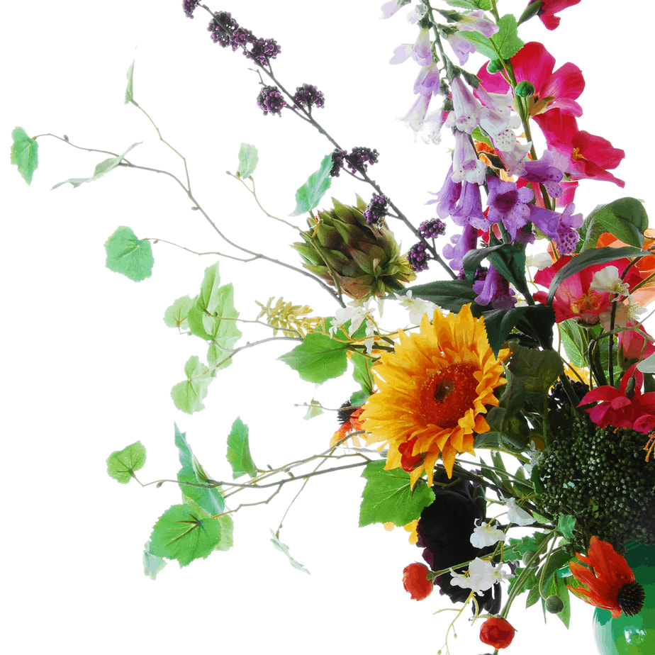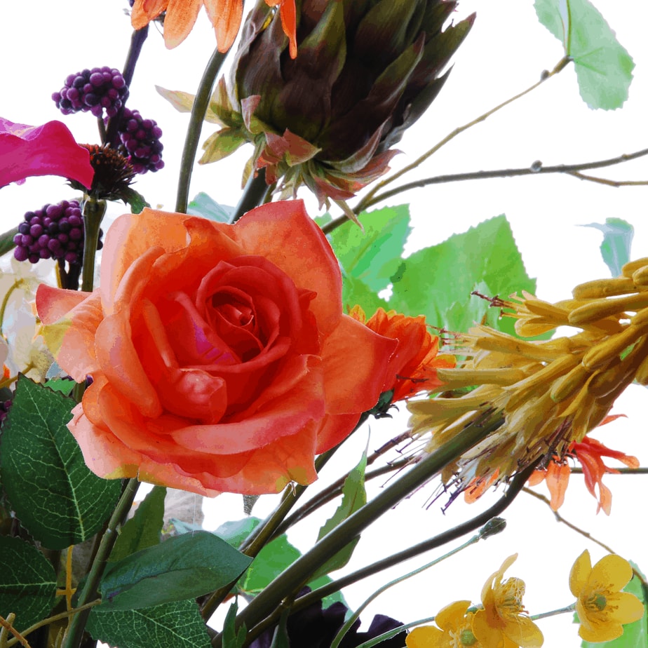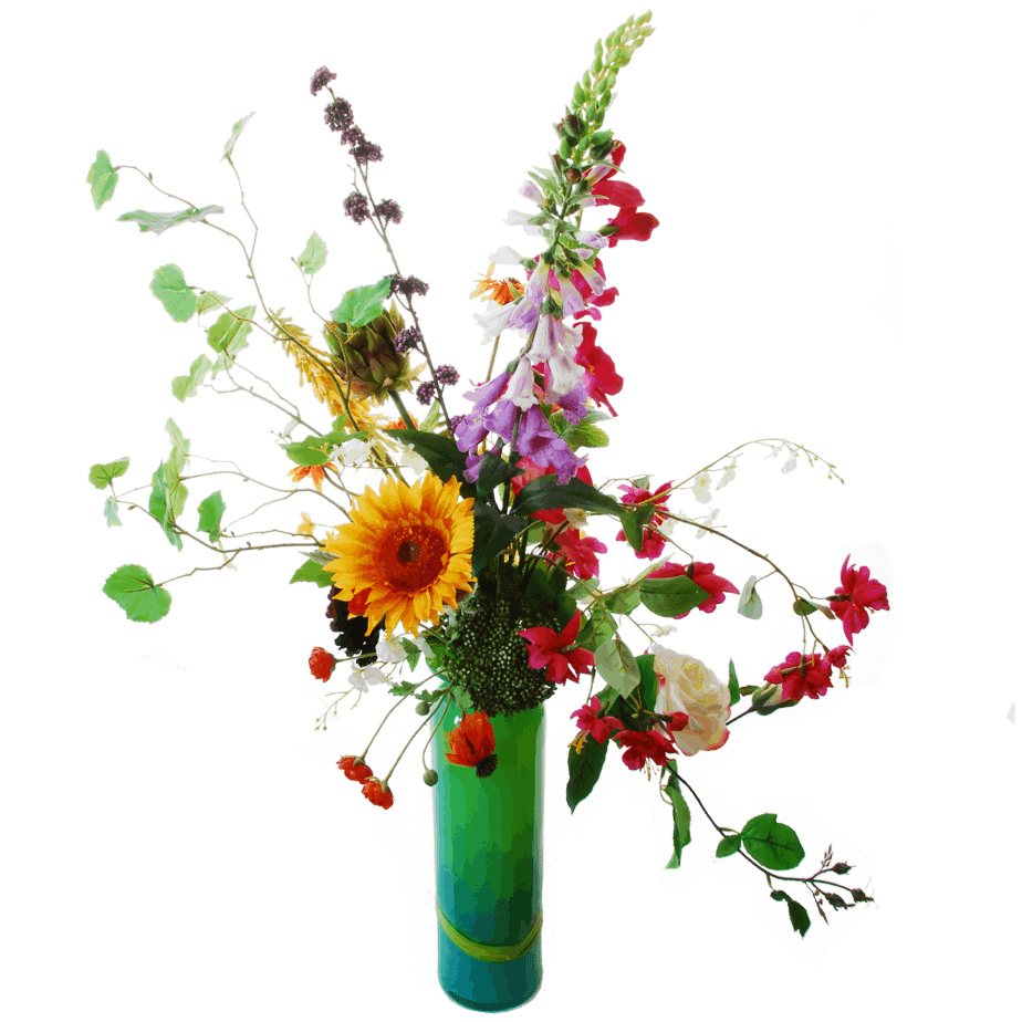 In dit boeket zitten perfecte imitaties van zijden bloemen en kunstbloemen in de kleuren geel, paars, oranje, rood, fuchsia, blauw en roze. Het kunst bloemen boeket is opgemaakt uit een zonnebloem, ranonkels, klaprozen, digitalis, fuchsia, callicarpa, duikkruid, een artisjok, een vuurpijl, echinacea, kleine ochideetjes, hortensia in de knop, boterbloempjes, een prachtige oranje roos, een donkere pioenroos en een stokroos. Alles aangevuld met een super mooie nagemaakte tak van een berk.