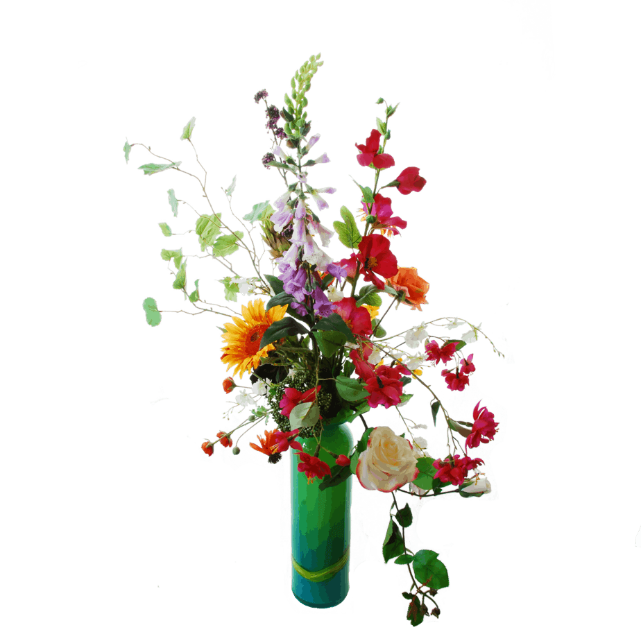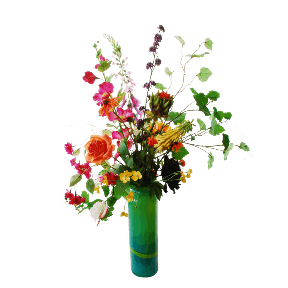 Schitterende bos bloemen van zijden bloemen en kunstbloemen van ‘real touch’ in de Fidrio vase Riga.