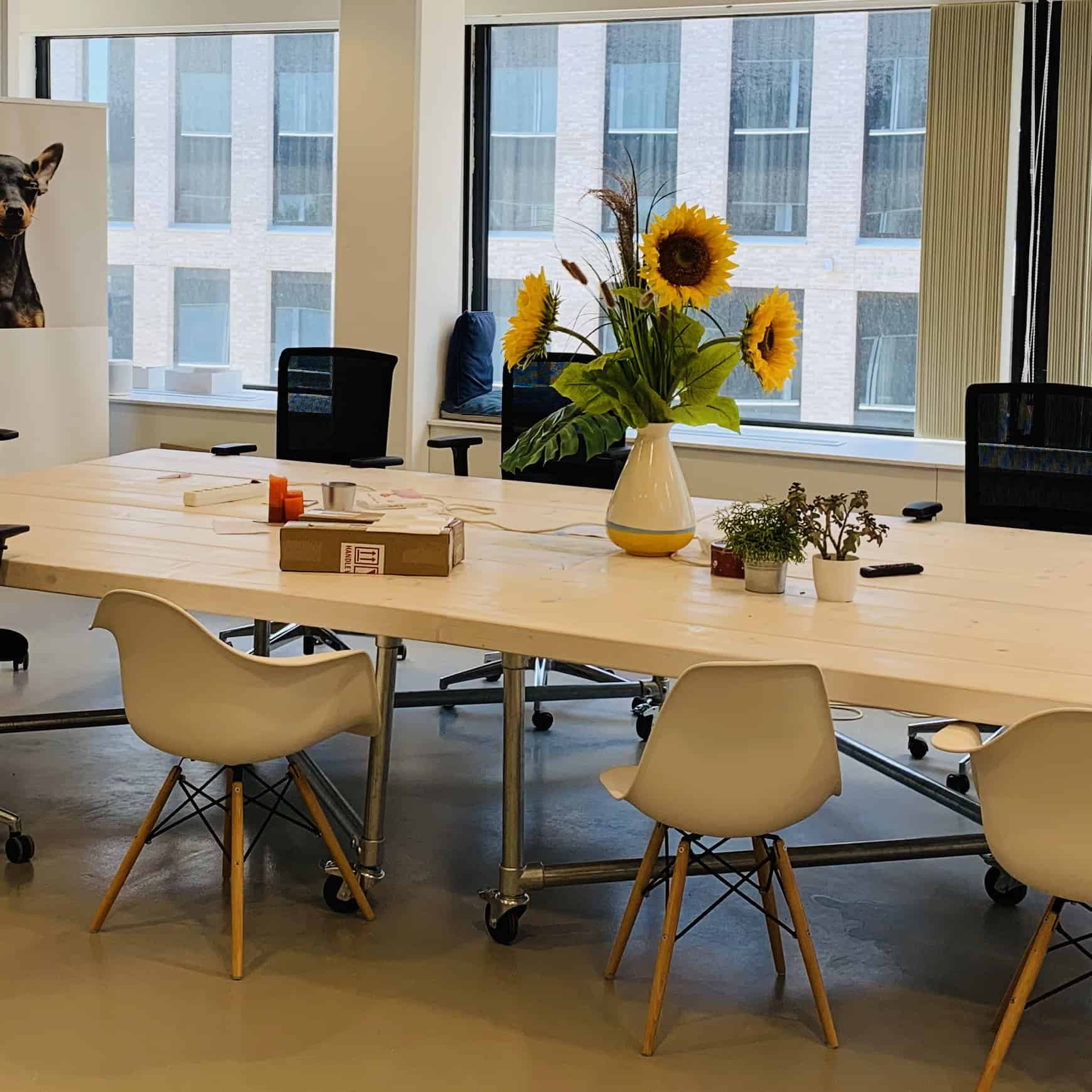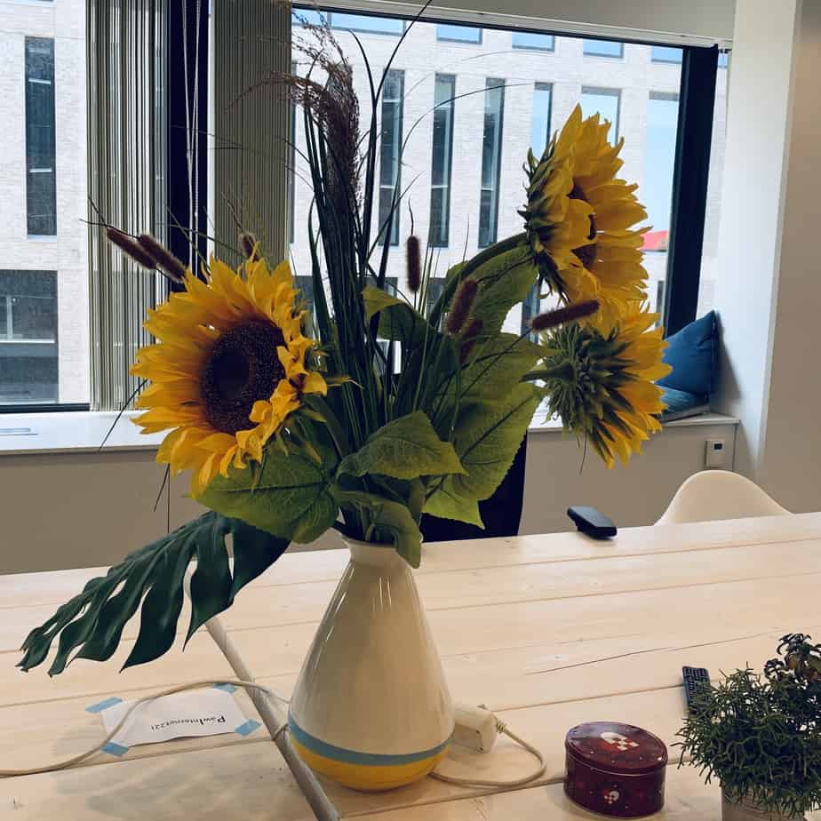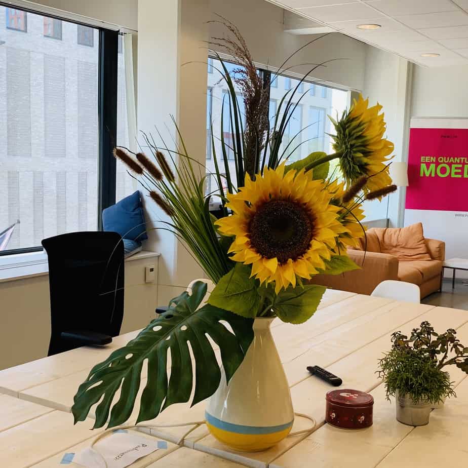 ‘Nauwelijks van echt te onderscheiden kunstboeket van Zonnebloemen, Lisdodden, rietstengels en een Monsterablad in een Piet Hein Eek vaas.