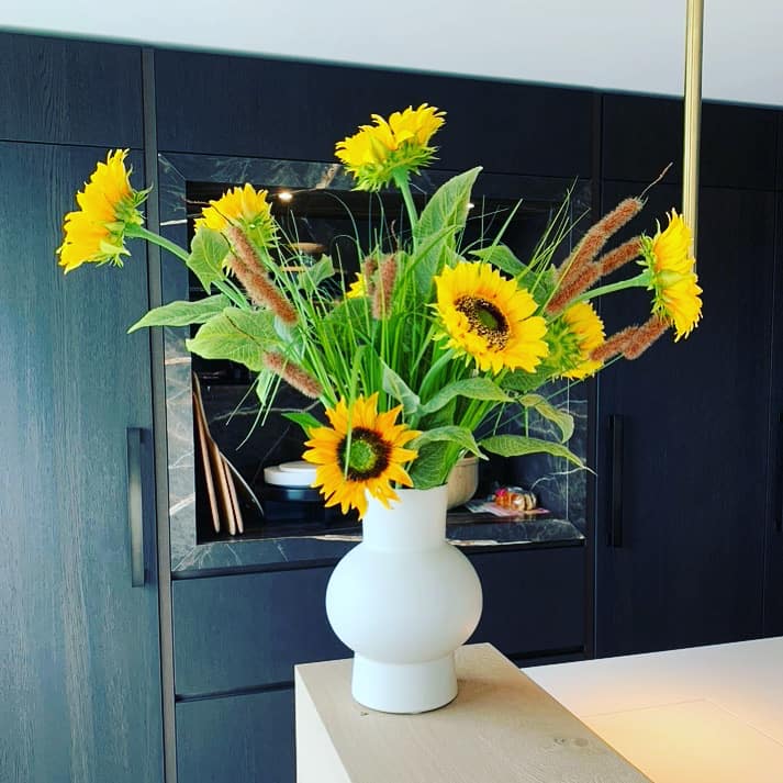 Je kunt de bloemen en takken uit onze bloemenwinkel ook allemaal goed combineren met verse bloemen, zolang je de steel van deze Hellianthus niet afknipt. Als je dat namelijk doet, is de steel niet meer afgesloten en komt het ijzer in de steel in aanraking met het water in de vaas. Het ijzer zal dan gaan roesten. ‘Met vies water en mogelijk een roestplek in jouw vaas als gevolg. Sonde!