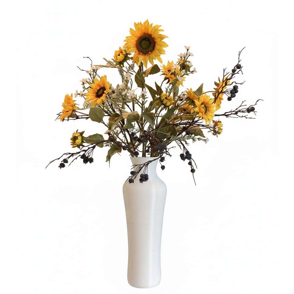 Zonnebloemen boeket kunstbloemen van ongeveer 100 cm hoog met prachtige geel-blauwe combinatie. Dit zonnebloemen boeket is een weelderige samenstelling van meerdere zonnebloemen, bessentakken en decoratief groen. Het zonnebloemen boeket heeft verschillende groottes bloemen gemaakt van hoogwaardig zijdemix materiaal. De stelen bevatten ijzerdraad waardoor je elk onderdeel elegant kunt positioneren. Perfect voor grote vazen of als indrukwekkende centerpiece. Laat de takken natuurlijk over de vaasrand krullen voor maximaal effect!